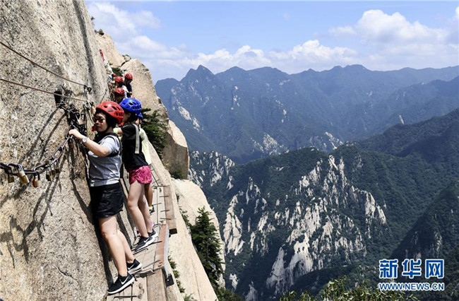 被譽(yù)為“華山第一天險(xiǎn)”的長(zhǎng)空棧道,位于陜西省華陰市五岳華山南峰東側(cè)山腰,在萬(wàn)仞絕壁上鑲嵌石釘搭木椽而筑。 由于長(zhǎng)空棧道貼崖懸空,對(duì)探險(xiǎn)獵奇者極具誘惑性和挑戰(zhàn)性,吸引歷險(xiǎn)探勝者絡(luò)繹不絕。新華社記者 陶明 攝