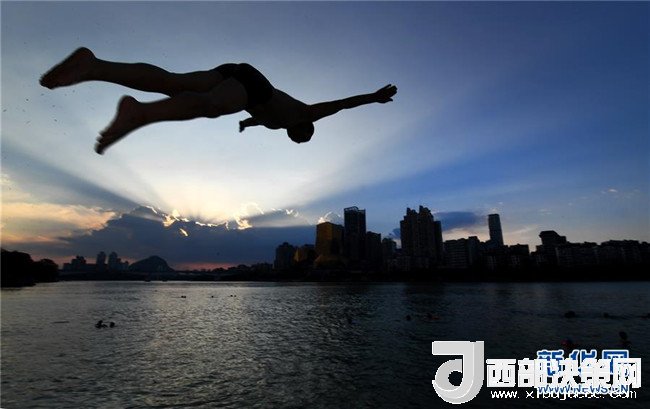 7月18日,在廣西柳州市柳江趙家井水域,市民在江面上跳水。