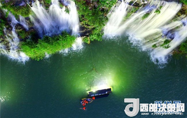 7月18日,市民在廣西柳州市蟠龍山瀑布群下戲水消暑(無人機(jī)拍攝)。