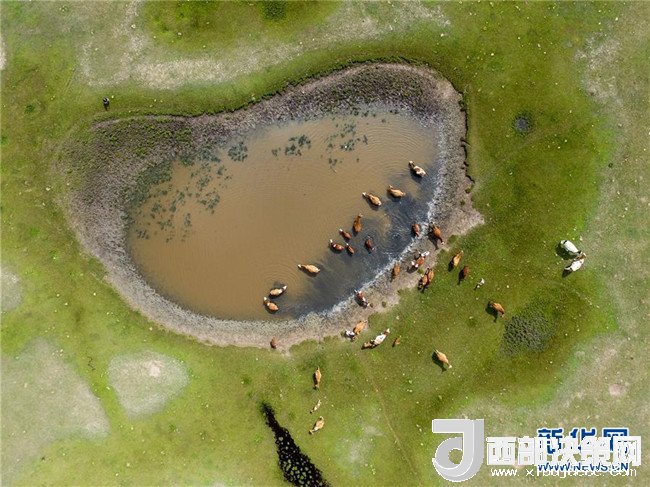 牛群在錫林郭勒盟正藍旗的草原上飲水(7月16日無人機拍攝)。