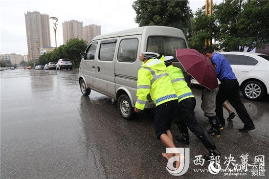2018年8月4日,云南省昭通中心城市,交警赤腳和城市綜合執(zhí)法工作人員冒雨幫助市民推車(chē)。攝影:張廣玉