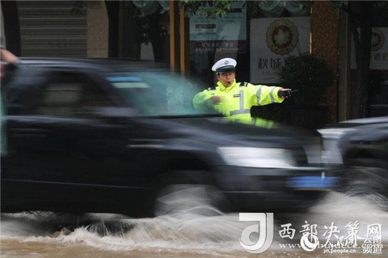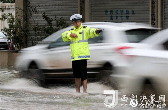 近日,云南昭通大雨導(dǎo)致街道積水嚴(yán)重,昭通中心城市鳳霞路與望海公園環(huán)湖北路交叉口積水最深處達(dá)50公分。一位交警赤腳冒雨在積水中指揮交通幫市民推車(chē)的畫(huà)面被市民抓拍下來(lái),市民表示,交警赤腳在風(fēng)雨中忙碌工作的身影令人難忘感動(dòng)。 (徐前)