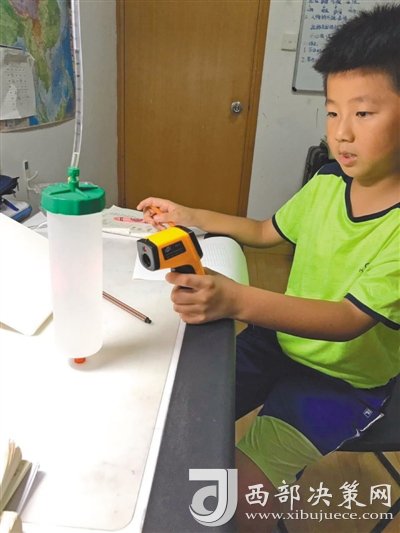 首先設(shè)計(jì)一個裝置,下部寬大的容器盛水,上部細(xì)長的管子可以觀察水的體積變化。然后將裝滿水的容器放入冰箱冷凍層,形成冰水混合物,此時水溫接近零攝氏度。最后將容器取出,用手持式測溫儀測量水溫……這一系列步驟,不是實(shí)驗(yàn)室里進(jìn)行的專業(yè)研究,而是南京師范大學(xué)附屬小學(xué)四年級學(xué)生徐子越和王美澄正在做的暑假作業(yè),他們通過觀察水的體積隨溫度的變化,來解釋冰為什么會浮在水面上。