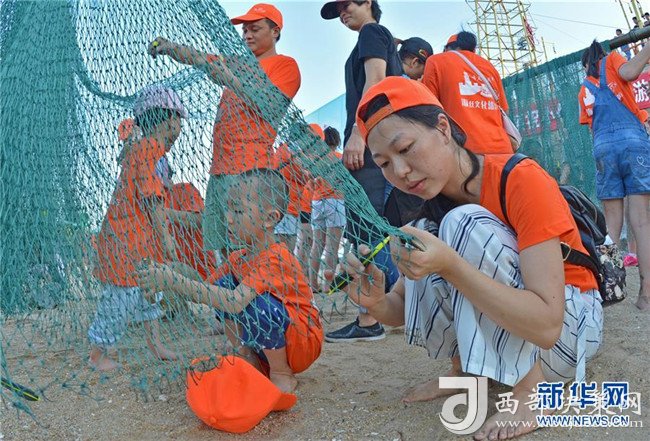 8月8日,“小候鳥”們與家長一起體驗漁網制作。
