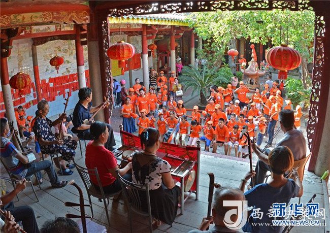 8月8日,“小候鳥”們與家長一起欣賞非物質文化遺產——北管。
