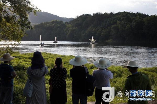 8月15日,在麗水市蓮都古堰畫鄉(xiāng)小鎮(zhèn),游客在拍攝漁民捕魚畫面。
