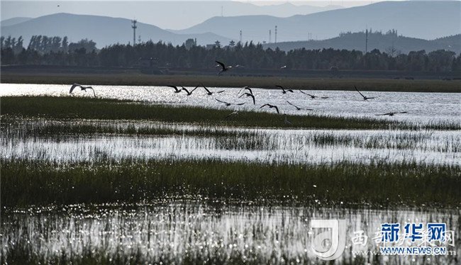 8月22日,野鳥在廣靈縣壺流河濕地飛翔。新華社記者 陶明 攝