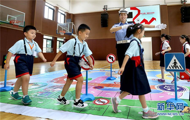 9月3日,小學(xué)生在民警指揮下模擬通過(guò)人行橫道。