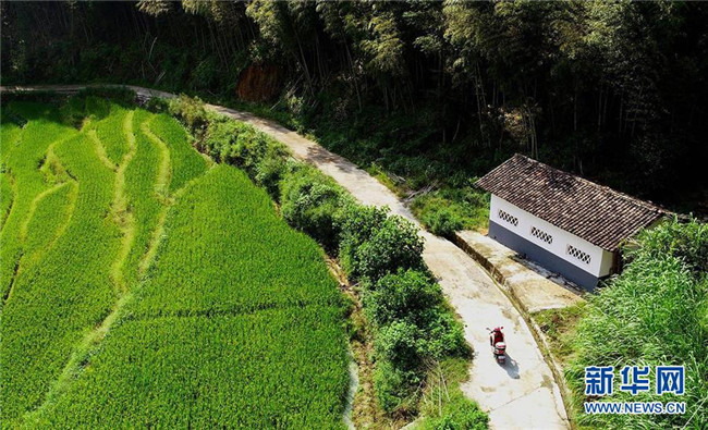 9月4日,陳春英騎摩托車前去領(lǐng)取學(xué)生們的營(yíng)養(yǎng)餐(無(wú)人機(jī)拍攝)。新華社記者胡晨歡 攝
