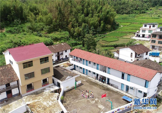 9月4日,陳春英和學(xué)生們?cè)诓賵?chǎng)上玩游戲(無(wú)人機(jī)拍攝)。新華社記者胡晨歡 攝