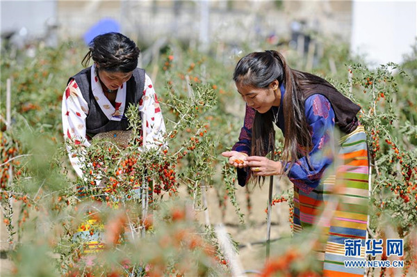 產(chǎn)業(yè)園員工那珍(左)和多吉卓瑪在采摘枸杞(9月5日攝)。