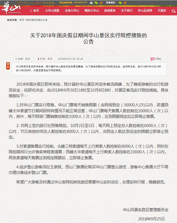 關(guān)于2018年國(guó)慶假日期間華山景區(qū)實(shí)行限控措施的公告