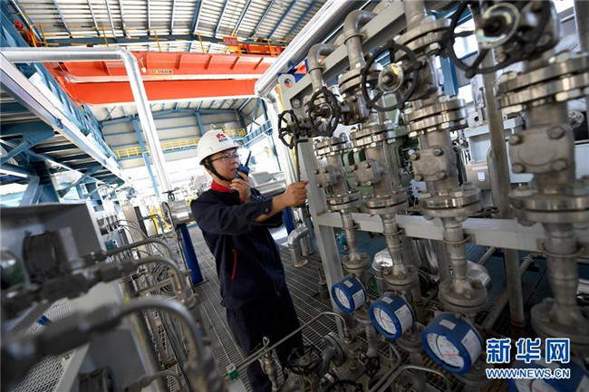 延安煤油氣資源綜合利用項目甲醇制烯烴中心的工作人員在進行設(shè)備巡檢(9月28日攝)。新華社記者 劉瀟 攝