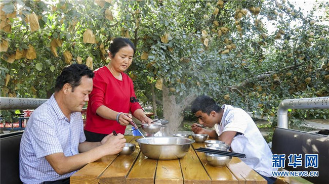 甘永軍(左一)在地處新疆阿克蘇地區(qū)柯柯牙綠化工程內(nèi)的果園吃飯(2017年9月22日攝)。10年前,甘永軍還在果園開起了第一個農(nóng)家樂,帶動周邊100多戶果農(nóng)經(jīng)營起了自家庭院。新華社記者 杜剛 攝