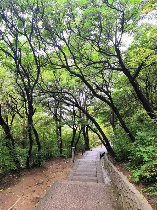清晨,陽(yáng)光穿過(guò)樹(shù)林灑在石階上,斑駁的光影隨風(fēng)自在地?fù)u晃。茂密的樹(shù)林蒸騰起無(wú)數(shù)看不見(jiàn)的水汽,溫潤(rùn)的撲在臉上,令人心曠神怡。