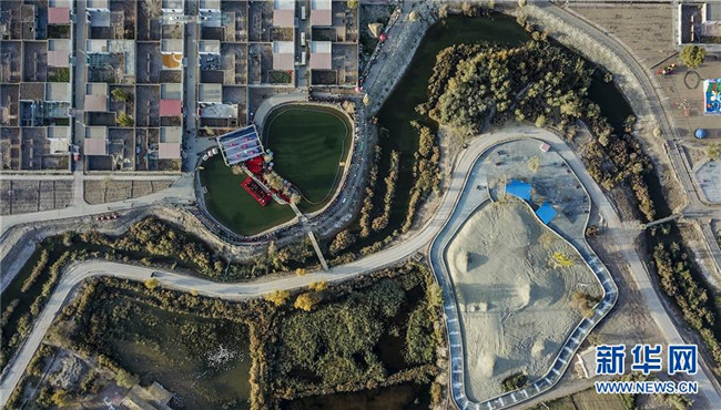 新疆巴楚縣阿納庫(kù)勒鄉(xiāng)果勒買里村濱河體育文化公園(10月22日無人機(jī)拍攝)。 新疆巴楚縣阿納庫(kù)勒鄉(xiāng)果勒買里村緊鄰巴楚縣城,區(qū)位優(yōu)勢(shì)明顯。近年來,新疆維吾爾自治區(qū)體育局“訪民情”“惠民生”“聚民心”駐村工作隊(duì)幫助村里完善基礎(chǔ)設(shè)施和改善村容村貌,借助節(jié)慶活動(dòng)大力發(fā)展鄉(xiāng)村旅游,吸引周邊及外地游客前來觀光休閑,既豐富了村民的文化生活,又為村民增收致富拓寬了門路。 新華社記者 胡虎虎 攝