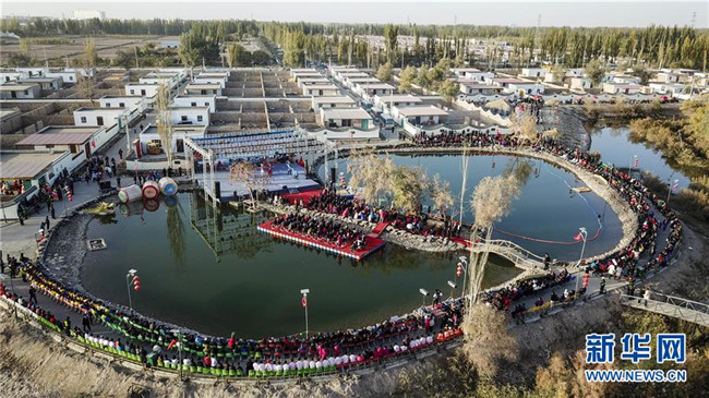 10月22日,在果勒買里村,游客和村民在觀看演出(無人機(jī)拍攝)。 新疆巴楚縣阿納庫(kù)勒鄉(xiāng)果勒買里村緊鄰巴楚縣城,區(qū)位優(yōu)勢(shì)明顯。近年來,新疆維吾爾自治區(qū)體育局“訪民情”“惠民生”“聚民心”駐村工作隊(duì)幫助村里完善基礎(chǔ)設(shè)施和改善村容村貌,借助節(jié)慶活動(dòng)大力發(fā)展鄉(xiāng)村旅游,吸引周邊及外地游客前來觀光休閑,既豐富了村民的文化生活,又為村民增收致富拓寬了門路。 新華社記者 胡虎虎 攝