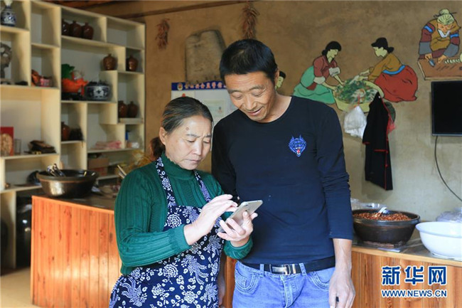 夏永春與妻子用手機(jī)查看訂單(10月10日攝)。貧困戶夏永春兩口子靠著地道鄉(xiāng)土手藝,在山東蘭陵縣金嶺鎮(zhèn)壓油溝風(fēng)景區(qū)里開了一家農(nóng)家特色咸菜坊,年收入一下躥升到七八萬元。新華社記者 王南 攝