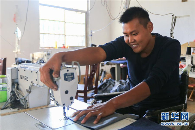 在山東蘭陵縣礦坑鎮(zhèn)朱柳屯村的扶貧車間,貧困戶范加誠操作縫紉機(jī)加工布料(10月10日攝)。今年29歲的范加誠八年前在建筑工地打零工時(shí)被因意外造成高位截癱。2016年,5萬元扶貧貸款為范加誠扶貧車間建設(shè)送來“及時(shí)雨”。一個(gè)月的時(shí)間,他就有了寬敞明亮的加工車間和8臺(tái)嶄新的縫紉機(jī)。新華社記者 王南 攝