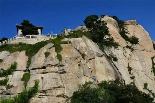 云梯,是從引鳳亭經(jīng)東石樓峰通往東峰的一段捷徑,云梯高十余米,與地面垂直呈90度角,中上部外突,呈倒坎崖之勢(shì)。梯上置懸索三條,游人挽索而攀,身體無(wú)法貼近崖壁,因而隨索擺動(dòng),心旌神搖,如同云駕霧,故名云梯。