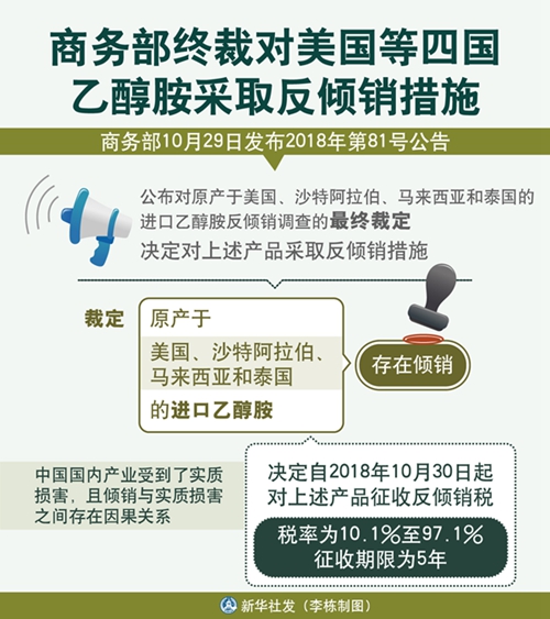圖表:商務(wù)部終裁對(duì)美國(guó)等四國(guó)乙醇胺采取反傾銷措施 新華社發(fā) 李棟 制圖