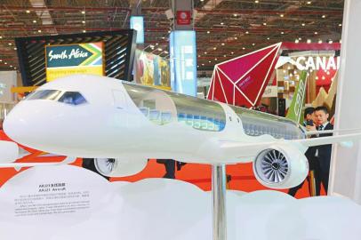 進口博覽會上展出的ARJ21支線客機模型。本版攝影 記者 李向雨