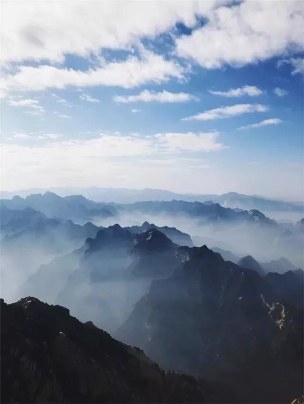 遠(yuǎn)處山巔的那片藍(lán),像是被初冬下過雪的清冷氣流滲入又渲染過得一樣,清明、澄澈、又讓你忍不住,陷入在這抹飄渺、悠遠(yuǎn)的華山藍(lán)里沉思、遐想……