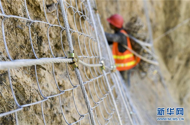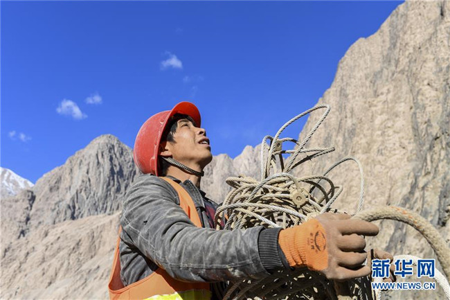 11月12日,在新疆塔什庫(kù)爾干塔吉克自治縣大同鄉(xiāng)鄉(xiāng)政府附近的一處路段,來自云南的王華國(guó)在運(yùn)送防護(hù)網(wǎng)。 近日,一支由四川、云南等地工人組成的施工隊(duì)忙碌在帕米爾高原深處的大山中,為塔什庫(kù)爾干塔吉克自治縣縣城至大同鄉(xiāng)道路的易落石路段安裝防護(hù)網(wǎng)。崇山峻嶺間,工人要攀爬至峭壁上施工作業(yè),如躍動(dòng)在大山間的“舞者”。據(jù)介紹,這支施工隊(duì)常年活躍在新疆山區(qū)道路的施工現(xiàn)場(chǎng),為風(fēng)險(xiǎn)路段加裝安全防護(hù)裝置,保障過往車輛和沿途村民出行安全。 新華社記者 胡虎虎 攝