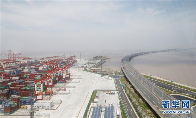 從洋山深水港四期無人碼頭控制塔上俯瞰碼頭集裝箱堆場(5月17日攝)。新華社記者方喆攝