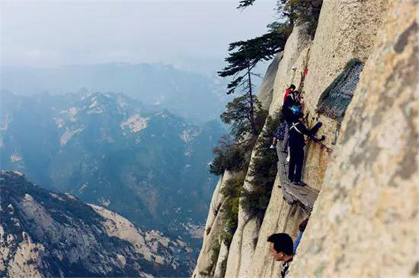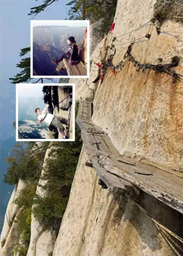 西岳華山歷來被認為是五岳之中最為險峻的,而在華山中,險中之險莫過于“長空棧道”和“鷂子翻身”。特別是具有700多年歷史的長空棧道,在華山南峰東側(cè)山腰的萬仞絕壁上鑿出來的幾個踏腳之處,鑲嵌石釘搭木椽搭建了一個百余米懸空的棧道,讓人望而卻步,如果你有恐高癥,僅僅看一眼都會讓你驚恐萬分。2013年,著名旅游網(wǎng)站“Smarter Travel”盤點全球最恐怖懸崖步道,將華山長空棧道列為全球十大最恐怖的懸崖步道之一。