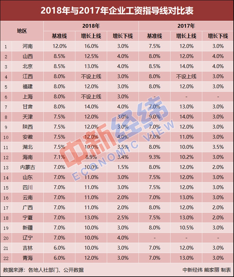 據(jù)中新經(jīng)緯客戶端(微信公眾號(hào):jwview)不完全統(tǒng)計(jì),截至12月6日,至少已有河南、山西、北京、江西、福建、上海等22個(gè)省份公布了2018年企業(yè)工資指導(dǎo)線。