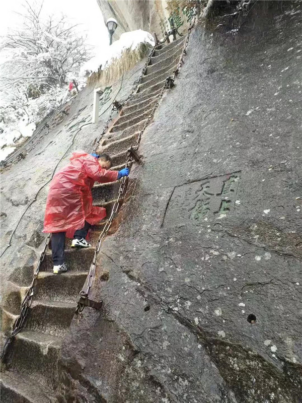 大概到了千尺幢,路就非常陡峭了,幾乎垂直攀登。戴上手套,登山杖收進背包,抓緊鐵鏈子,懸崖外寒風(fēng)呼嘯,雨雪交加,絕壁上的古松巍然屹立,驢友相互鼓勵有說有笑,天冷,但心是熱的。