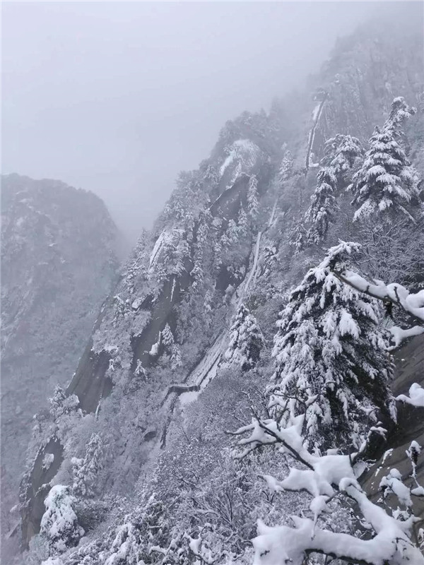 到了北峰和蒼龍嶺,這才是真正的華山,天氣不好,但是一樣很美。到處銀裝素裹,走在蒼龍嶺,這里有“韓愈投書”的故事,左手懸崖,右手深淵,就像這天地間孤獨的俠客,頭頂上傳來雷音陣陣,難道有修道高人在渡雷劫,準(zhǔn)備羽化成仙?