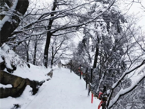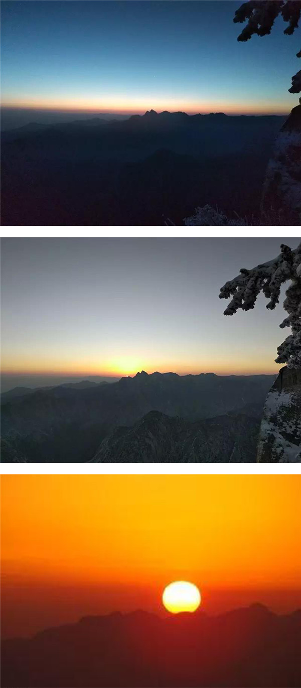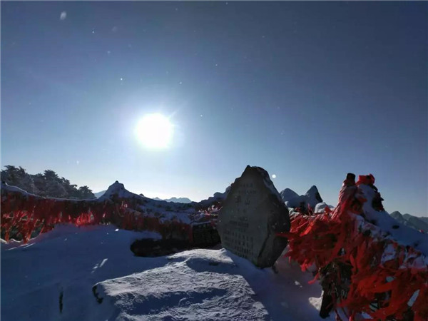 過后,又看到了下棋亭,長空棧道,華山松,西峰,南峰。想到金庸先生,想到“華山論劍”,“飛雪連天射白鹿,笑書神俠倚碧鴛”,伴隨了中國幾代人的武俠情懷。這里,金色的陽光,湛藍的天空,皚皚白雪;站在南峰仰天池上,左手秦嶺群山,右手八百里秦川,這就是華山之巔!
