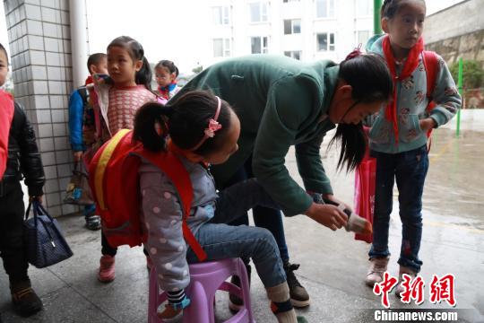 放學(xué)后,游成雪穿上襪子準(zhǔn)備回家。陳本強 攝