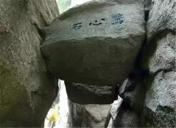 出千尺幢并不遠(yuǎn),便是百尺峽,這里是登山的第二道險(xiǎn)關(guān),兩壁高聳,中夾有一塊崩落下來的巨石,人從石下過,驚心動魄,抬頭望去,石上題有“驚心石”三個(gè)大字。