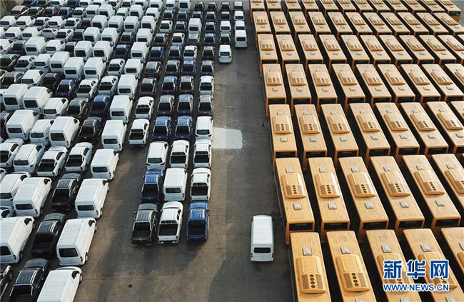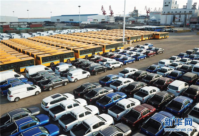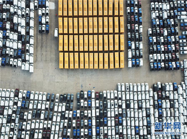 大批國(guó)產(chǎn)車(chē)輛在江蘇連云港港口碼頭等待裝船(2018年12月31日無(wú)人機(jī)拍攝)。 新華社發(fā)(耿玉和 攝)