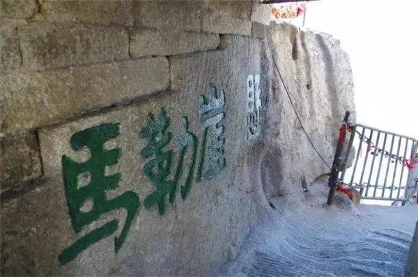 華山長(zhǎng)空棧道上下皆是懸崖絕壁,鐵索橫懸,由條石搭成尺許路面,下由石柱固定。由于棧道險(xiǎn)峻,故當(dāng)?shù)厝擞?ldquo;小心九厘三分,要尋尸首,洛南商州”之說(shuō)。這里只是探險(xiǎn)之道,并非登山必由之路,膽小人就在升表臺(tái)看看也就行了。所以在長(zhǎng)空棧道的入口處,就有這樣一塊石刻,上邊刻著“懸崖勒馬”四個(gè)大字。懸崖勒馬的字面意思就是說(shuō)在高高的山崖邊上勒住馬。比喻到了危險(xiǎn)的邊緣及時(shí)清醒回頭。面對(duì)長(zhǎng)空棧道這樣險(xiǎn)峻的地勢(shì),游人確實(shí)要比正常情況下更加清醒。