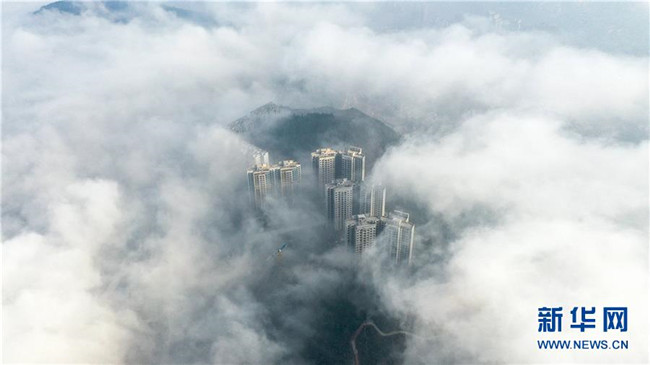 當(dāng)日,銅仁市萬(wàn)山區(qū)上空出現(xiàn)平流霧景觀,建筑物、山巒在霧氣中若隱若現(xiàn)。新華社發(fā)(伍衛(wèi)東攝)