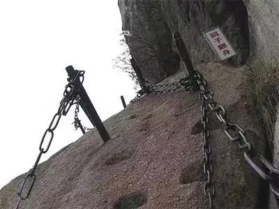 鷂子翻身:在華山東峰,是通往下棋亭的必由之路,為華山著名的險(xiǎn)道之一。其路鑿于倒坎懸崖上,下視唯見(jiàn)寒索垂于凌空,不見(jiàn)路徑。游人至此,須面壁挽索,以腳尖探尋石窩,交替而下,其中幾步須如鷹鷂一般、左右翻轉(zhuǎn)身體才可通過(guò),故名鷂子翻身。