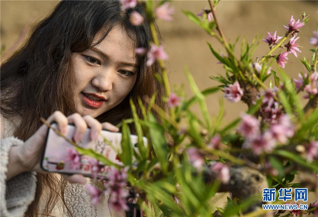 1月27日,在新疆鄯善縣辟展鎮(zhèn)大東湖溫室大棚基地內(nèi),游客在桃花前拍照。新華社記者王菲攝