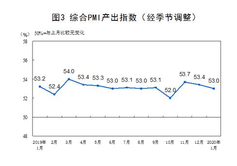 國(guó)家統(tǒng)計(jì)局今日公布數(shù)據(jù)顯示,截至2020年1月20日,采購(gòu)經(jīng)理調(diào)查結(jié)果顯示, 1月份,中國(guó)制造業(yè)PMI為50.0%,非制造業(yè)商務(wù)活動(dòng)指數(shù)為54.1%,綜合PMI產(chǎn)出指數(shù)為53.0%。