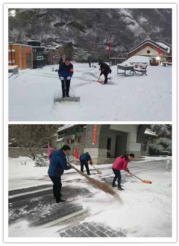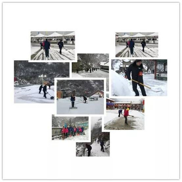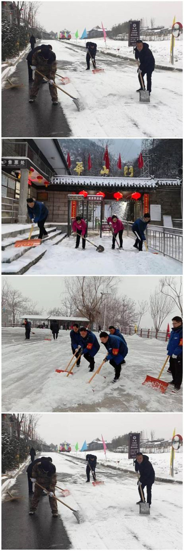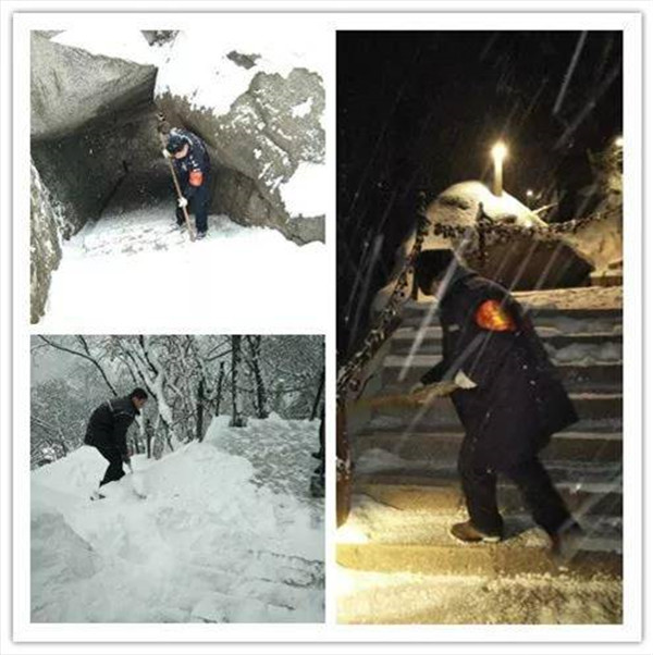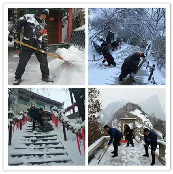2月9日晚,一場大雪突降華山景區(qū),當(dāng)工作人員與游客一起沉浸在新年的喜悅氛圍時(shí),華山景區(qū)悄然鋪上了一層厚厚的積雪。2月10日早6時(shí),華旅集團(tuán)通過多渠道號召全體員工在各自崗位迅速開展掃雪除冰工作。雪情就是命令,來不及欣賞新年首場雪景,廣大員工扛起掃把鐵鍬等掃雪工具,第一時(shí)間奔赴“戰(zhàn)場”,全力確保景區(qū)恢復(fù)運(yùn)營。