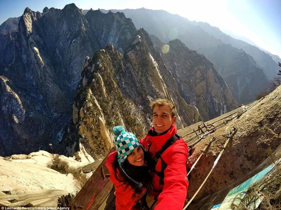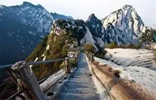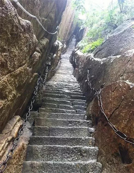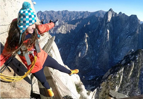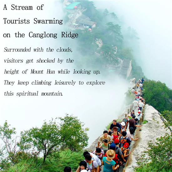 這是一個(gè)溫暖的美麗秋天,華山壯觀的峭壁在陽(yáng)光下閃閃發(fā)亮,稀有樹(shù)木炫耀著多彩的秋葉,遠(yuǎn)方跳躍的瀑布吸引著游客的眼球,奇形怪狀的點(diǎn)點(diǎn)白云在腳下緩緩流動(dòng)。我和我的朋友開(kāi)始了一場(chǎng)艱苦的旅行,一起攀登6,600多級(jí)鑿在巖石上的臺(tái)階,目標(biāo)是海拔2154.9米南峰之巔祭祀華山神的道觀。