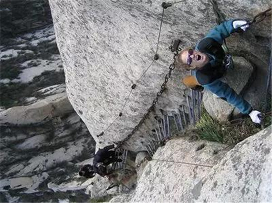 華山道路最危險(xiǎn)的地方當(dāng)屬“長(zhǎng)空棧道”,13英尺長(zhǎng),1英尺寬的木板就修在垂直的懸崖之上。在那里的一個(gè)失足就會(huì)使你墜入下面的萬丈深淵。棧道上有安全帶加以保護(hù),如果你想冒險(xiǎn)嘗試,綁上安全帶并把你系在繩索上,在一些地段,僅有一條安全帶和一些鑿在石頭里的腳窩作為支撐。