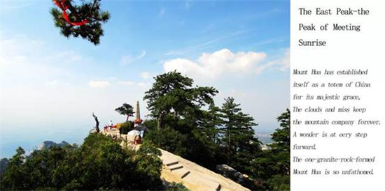 華山有五座主峰,從一定角度看就像一朵蓮花盛開在天際(中文的“花”),分別是東峰(朝陽峰),中峰(玉女峰),西峰(蓮花峰),北峰(云臺(tái)峰)以及最高最險(xiǎn)的南峰。