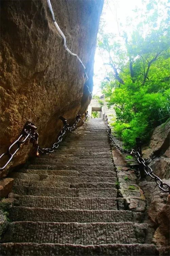 這里,山幢壁直立,其間僅容二人上下穿行。兩邊鐵鏈垂直下垂,狀如刀刻鋸截。坡度為70°。從上到下共有370多個臺階,皆不滿足寬。登時上視,一線天開,形如青蛙在跳,又如粘壁之鼯。下比上時更險,如臨深井,心驚目眩。故而常有人下來時倒退而行,從胯下窺視路面。“千尺幢”頂端,有僅容一人的石洞,因為當(dāng)人們爬上最后一個石級時,便從洞中鉆出,故而此洞名叫“天井”。“天井”上有一平臺,臺上刻寫的“太華咽喉”,形象的說明了這里的路形。