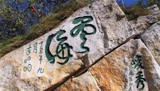 在蒼龍嶺上方平臺(tái)邊崖上刻有“云海”二字,落款就是“OO”題,不知“OO”是什么字?有人說是“昌”“明”二字,有人說是陜西關(guān)中方言“jiao”(意思就是太陽(yáng)光很火辣),到底是什么字,至今既無稽可考,也無典可查,成為一大字謎。