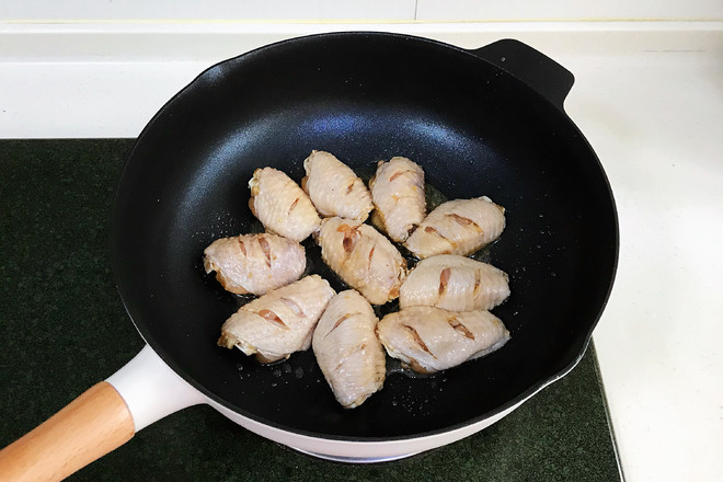 6.腌制好的雞翅,用廚房紙吸干表面的水份,煎制時(shí)才能上色。開中火,不粘鍋里倒入少許食用油,油熱后放入雞翅。