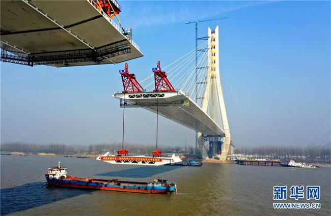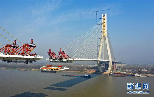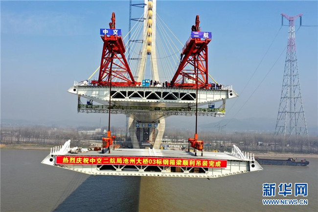 安徽池州長江公路大橋主橋長5.8千米,為雙塔雙索面斜拉橋,主跨828米,是連接安徽長江兩岸的又一條快速通道,預計3月底實現主橋合龍,6月底具備通車條件。
